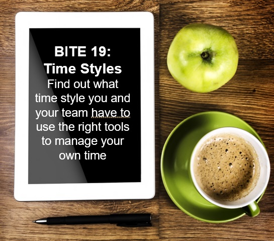 Bite 19: Understanding time styles. Something that’s often missed in time management training, is understanding what time management style you have, what challenges it creates for you personally and then how to overcome this. Never fear, this bite is here to help! You’ll uncover why your own personal time crunches can occur and different methods that suit your style, so you can get through what you need.