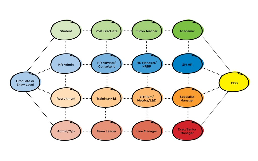 Here is the career map. The green row is if you follow an academic career, the blue row a generalist HR career, the orange are specialist areas which you can move into a various points from a generalist role, or vice versa. You may also work in operational roles that have HR responsibilities (the bottom row). It’s fantastic to see that CEO’s are now starting to be appointed from having an HR or people and culture background!